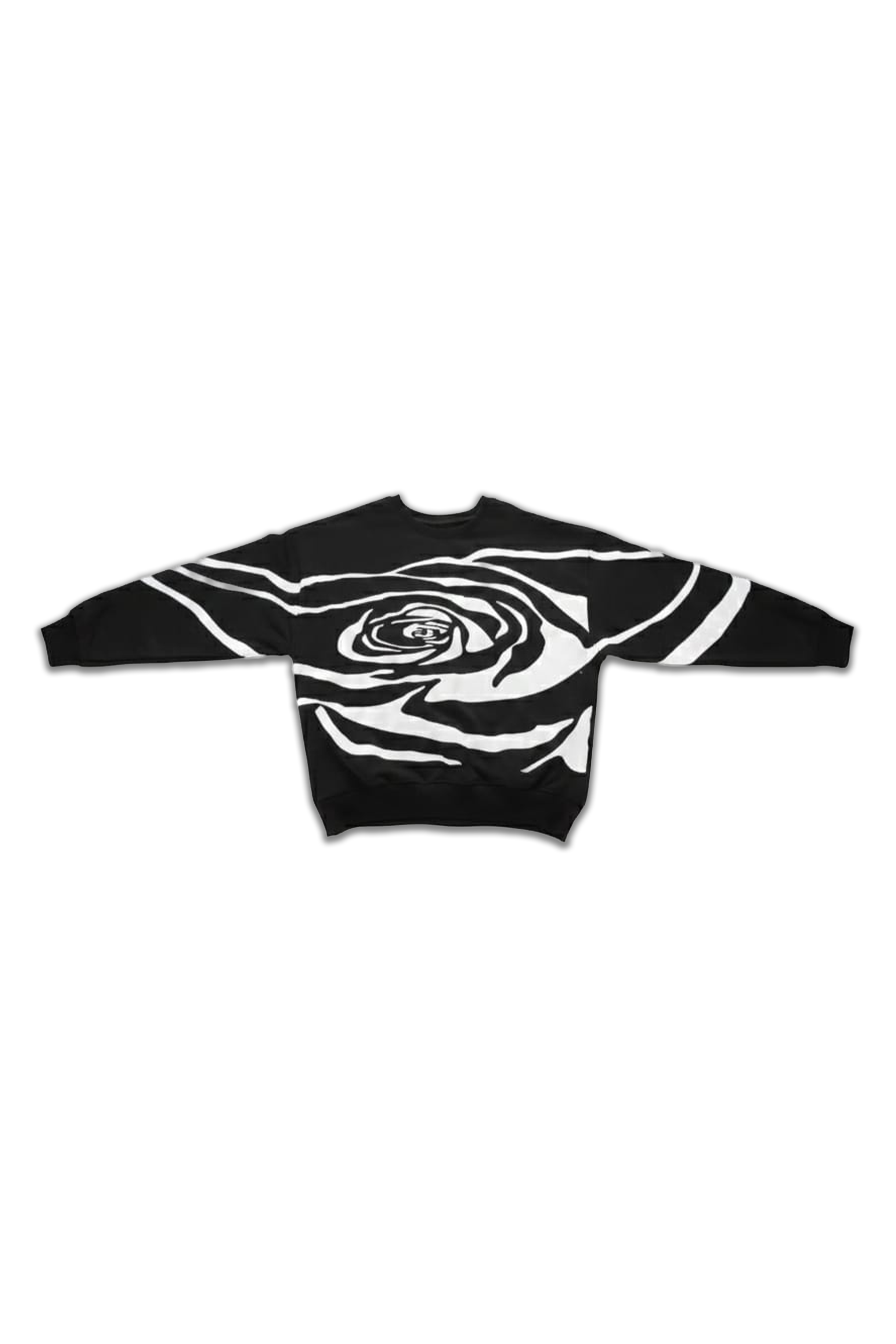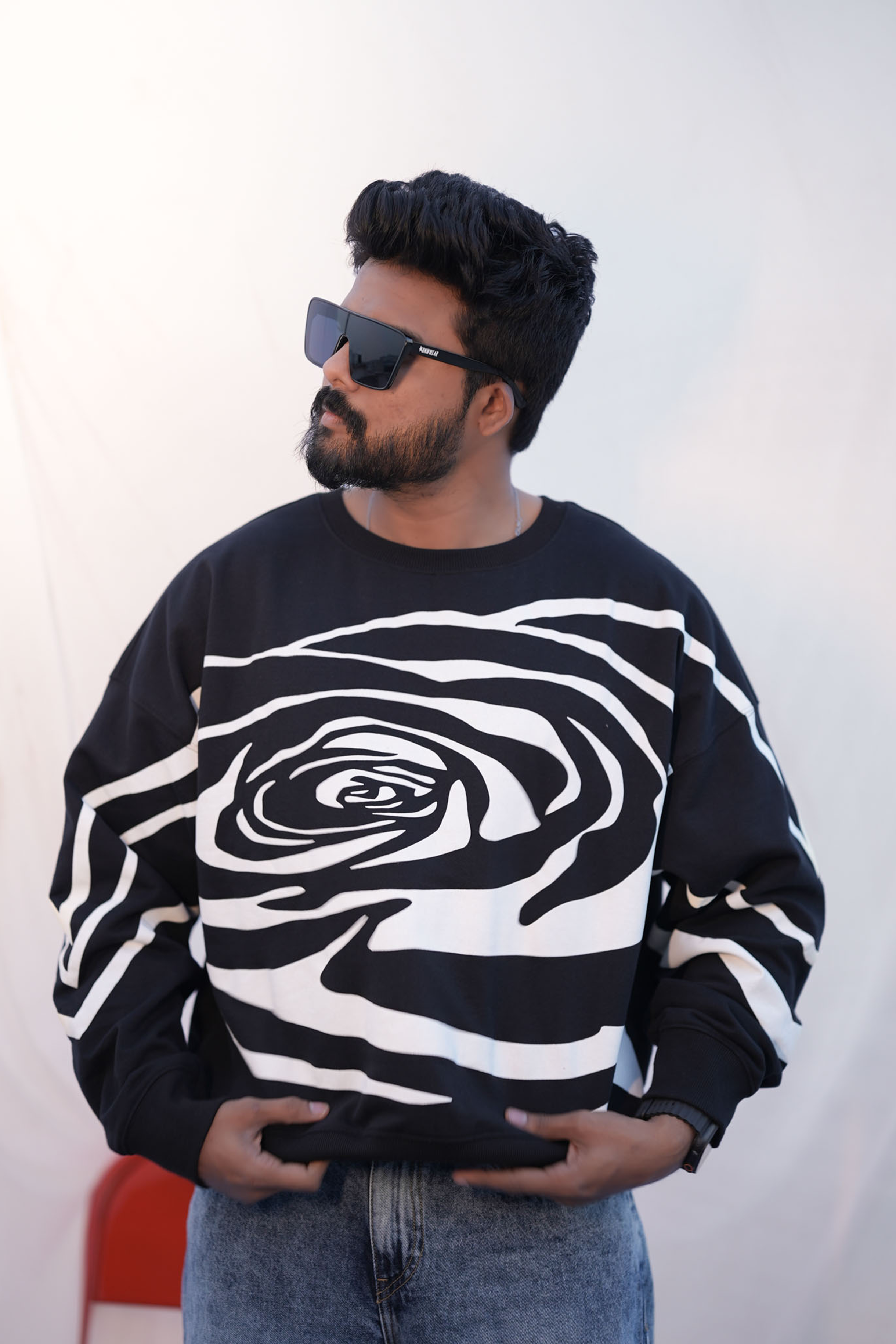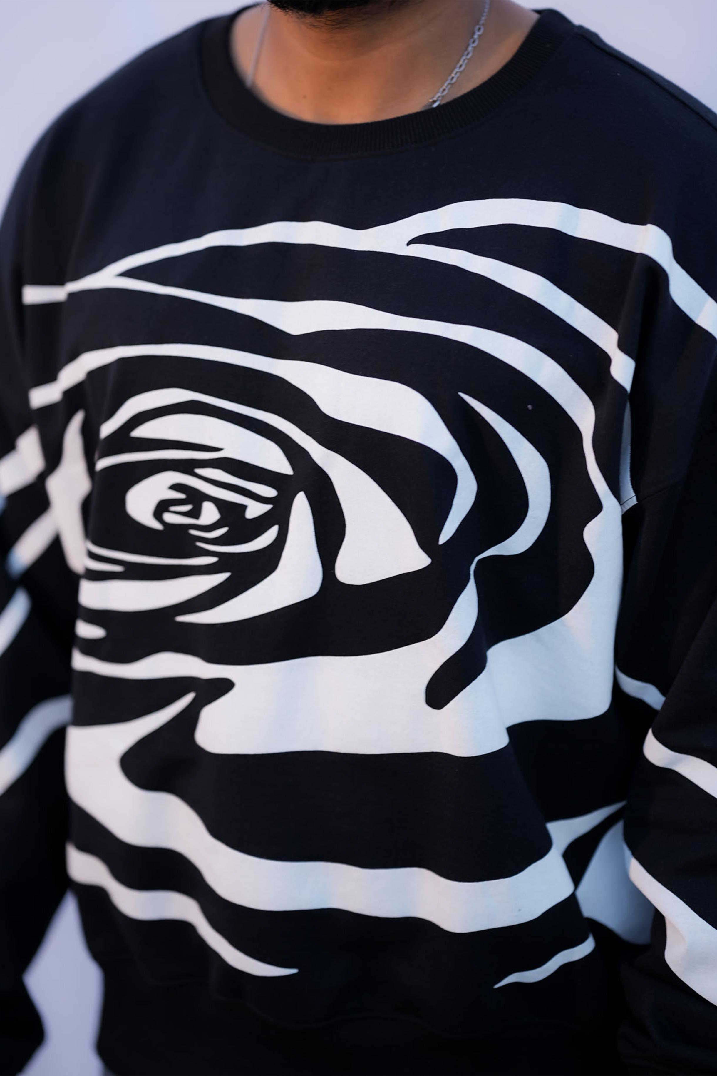 Product Description: An oversized sweatshirt featuring our signature Rosebloom motif: an abstract rose that wraps around the body like fluid art. Crafted in a rich maroon and jet-black palette, this piece blends comfort with statement design. Soft fleece lining, ribbed cuffs, and a dropped-shoulder fit make it the perfect cosy yet elevated winter essential.