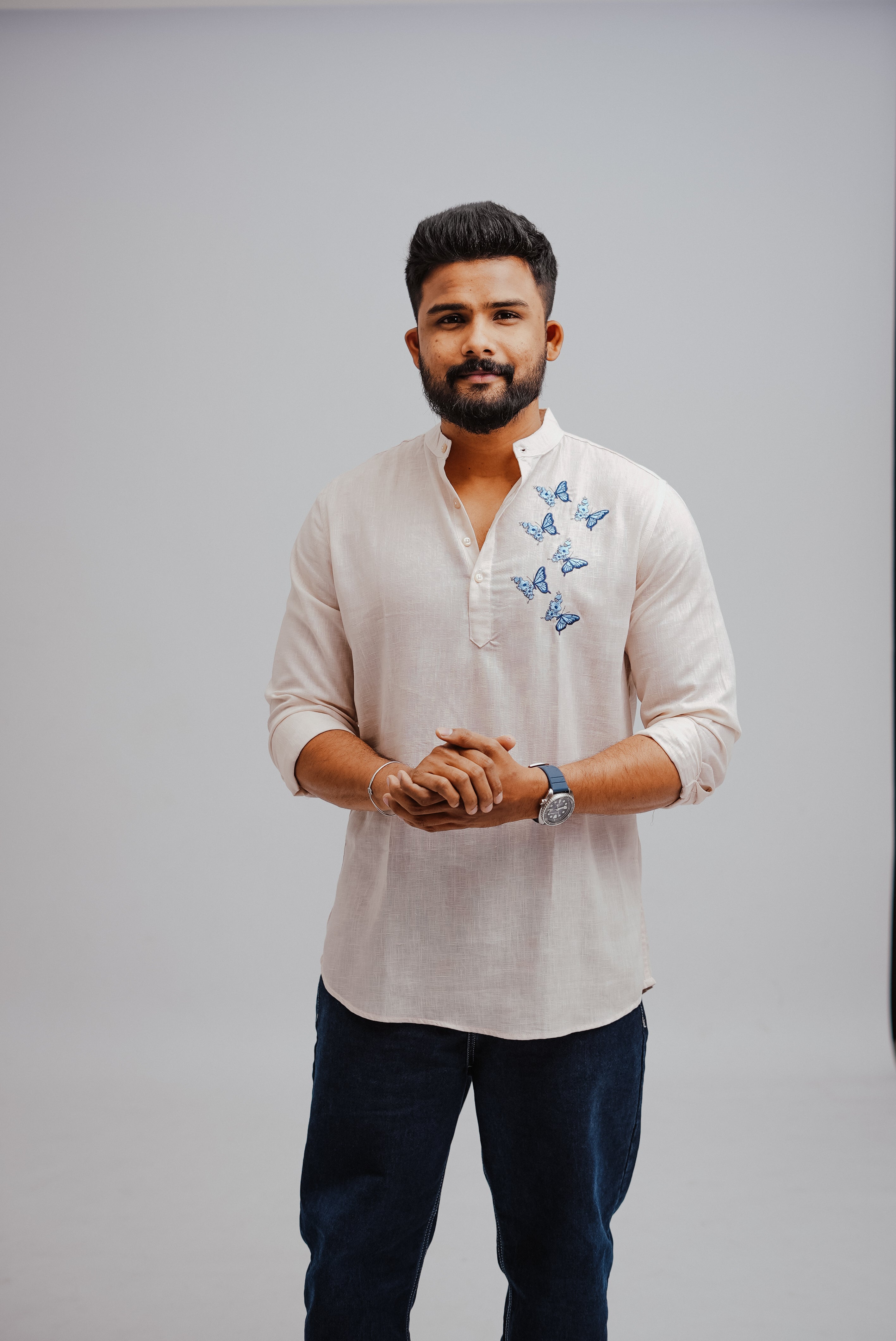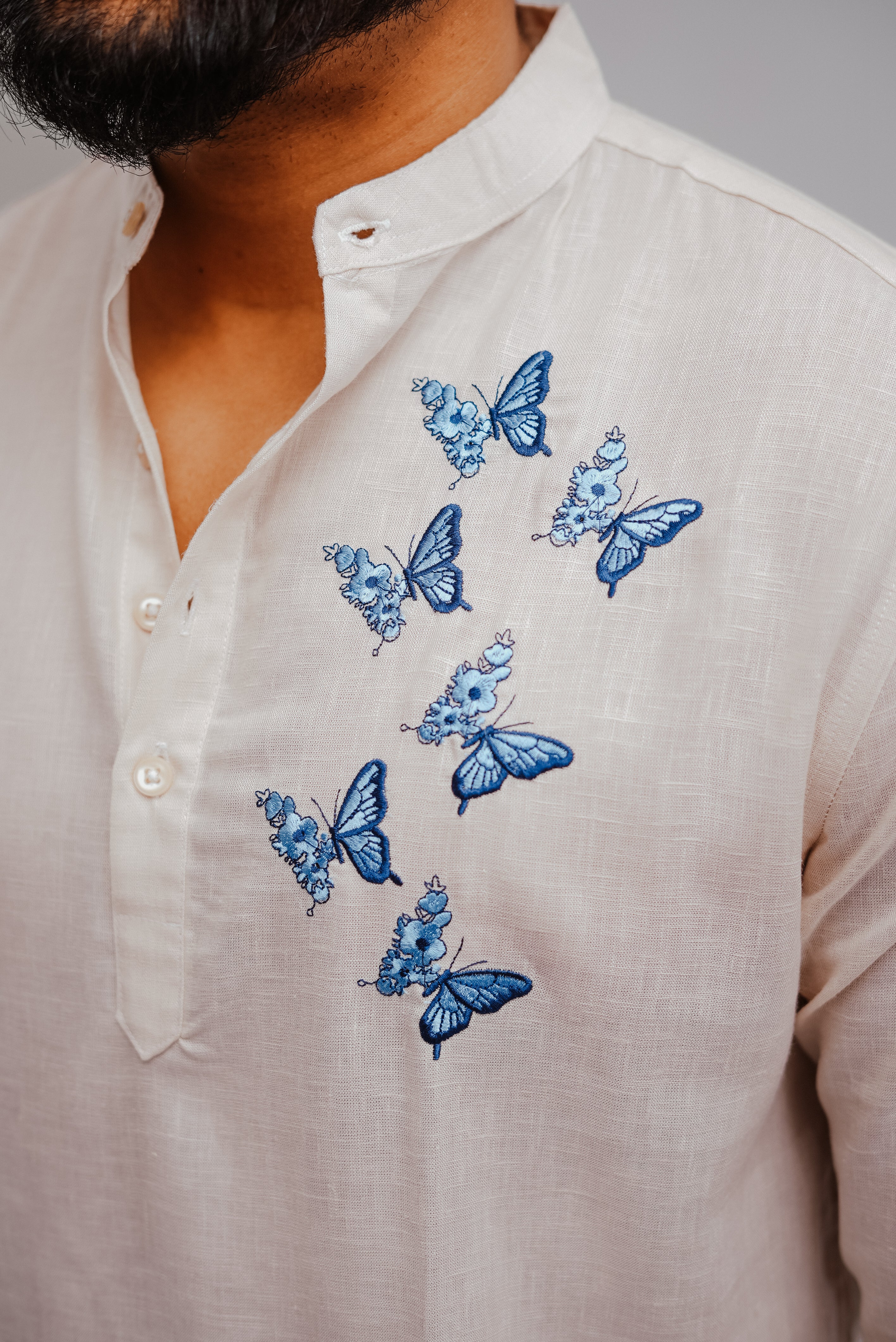 The Butterfly Effect is a modern short kurta made from soft, lightweight linen, ensuring comfort without compromising style. The diagonal butterfly embroidery captures movement and freedom, creating a striking focal point. Style it with straight-cut or linen pants for a contemporary menswear look, ideal for daytime events, casual celebrations, or festive occasions.