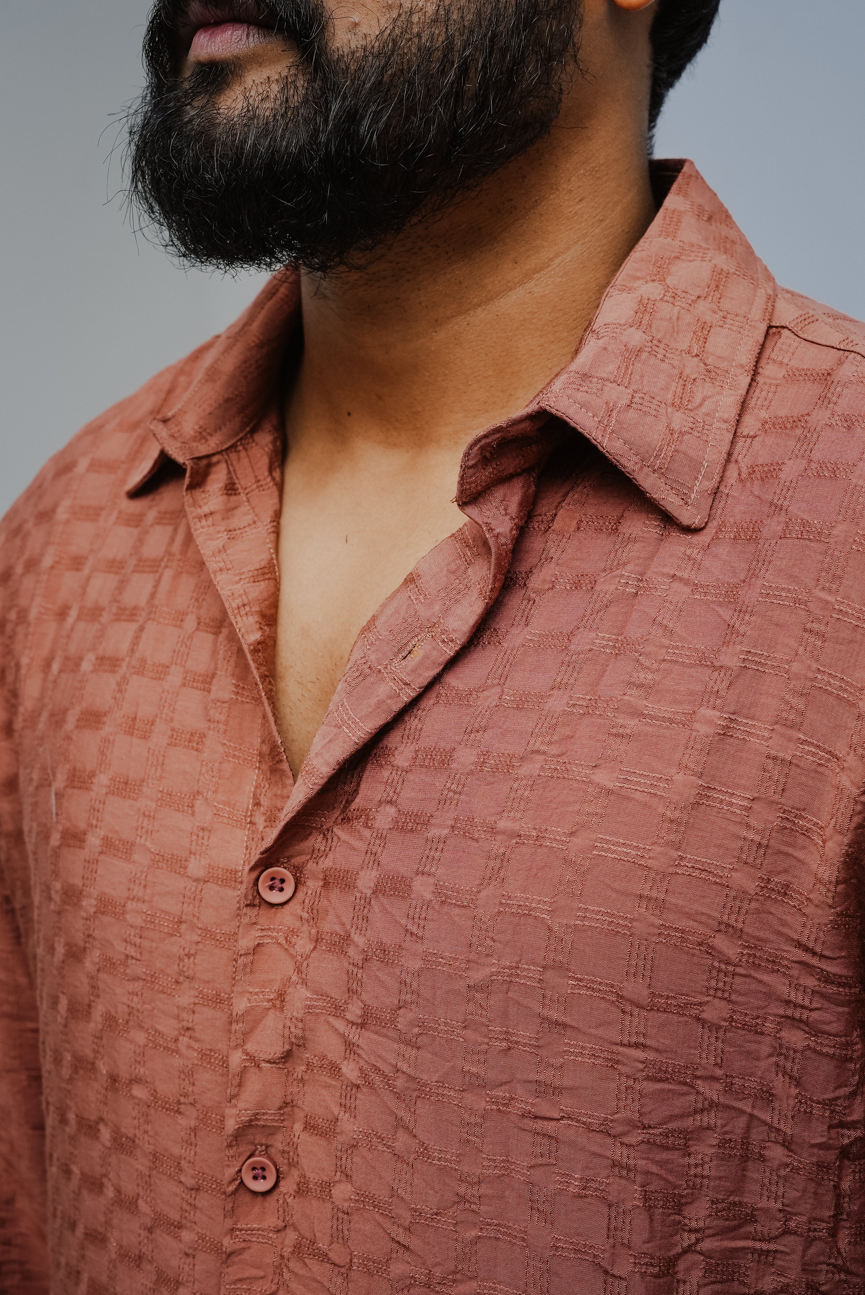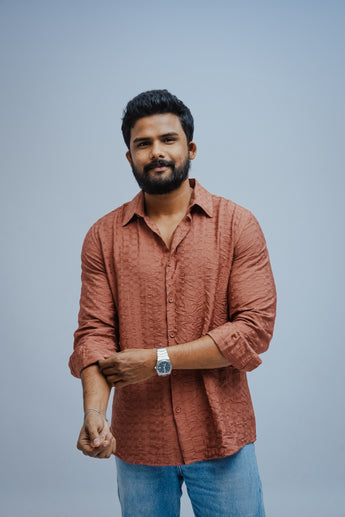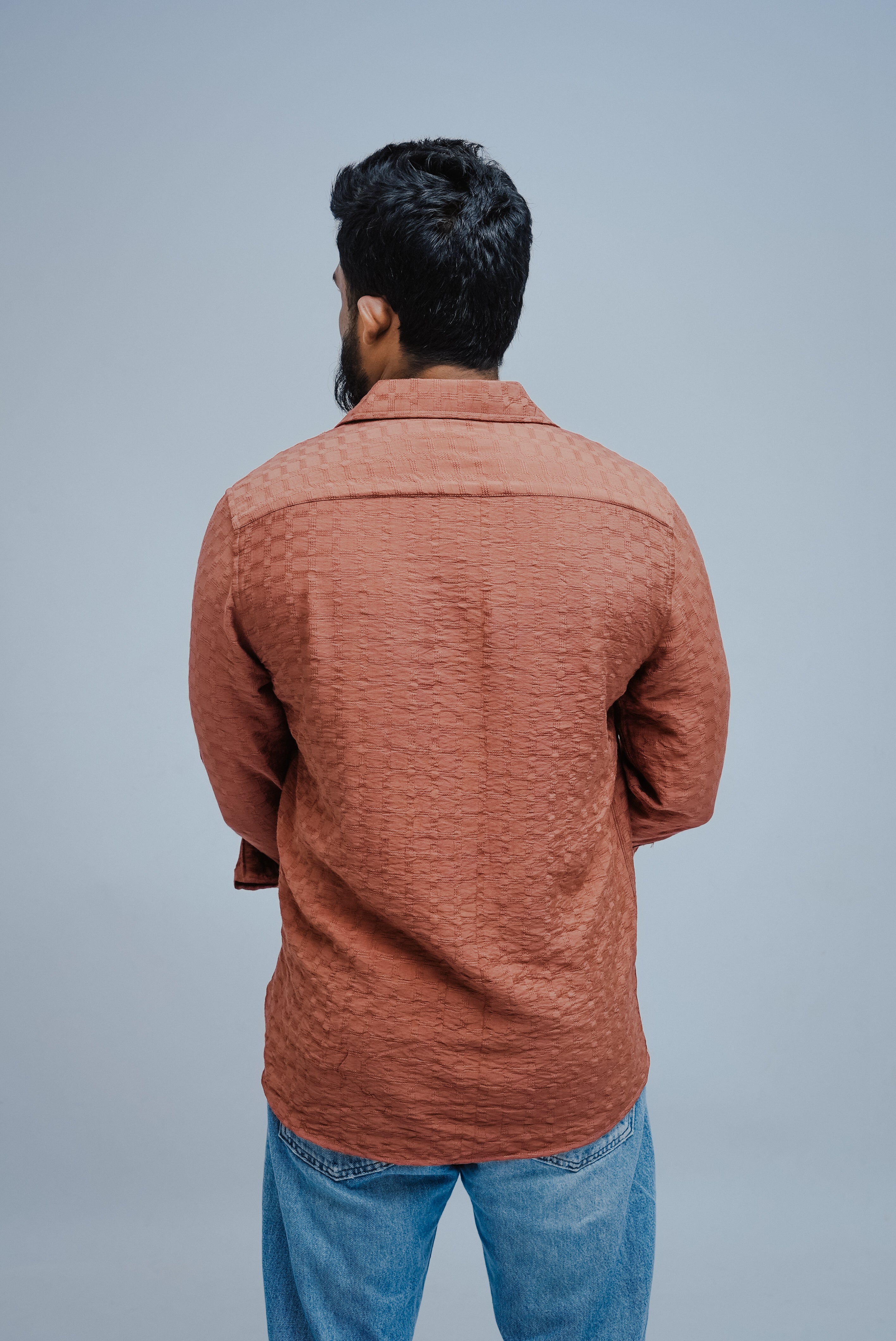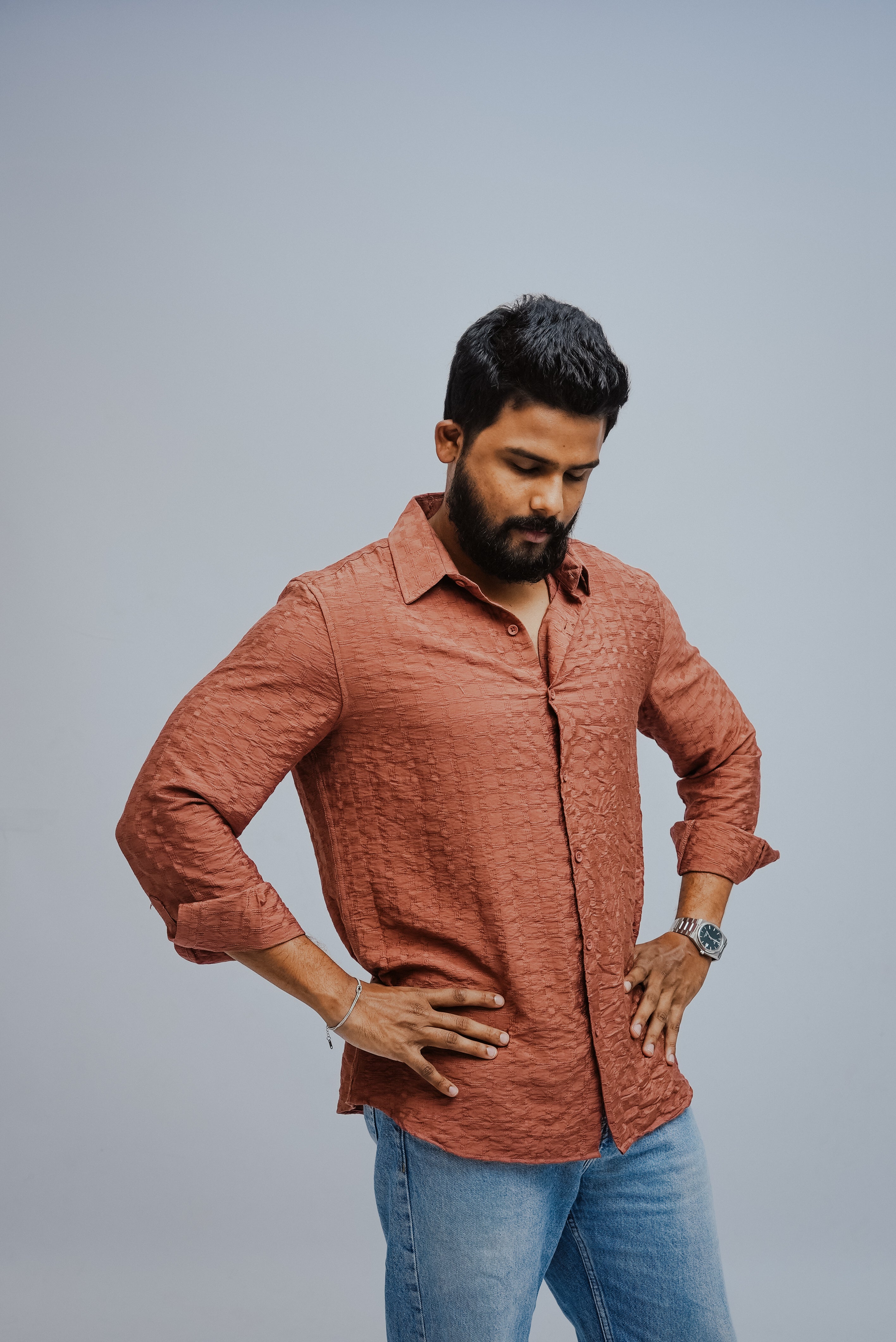 Crafted from soft, breathable cotton, this slim-fit shirt features a textured finish that adds depth and character to its design. The rich brown tone makes it a versatile choice, offering a refined yet modern edge for semi-formal and smart-casual occasions.