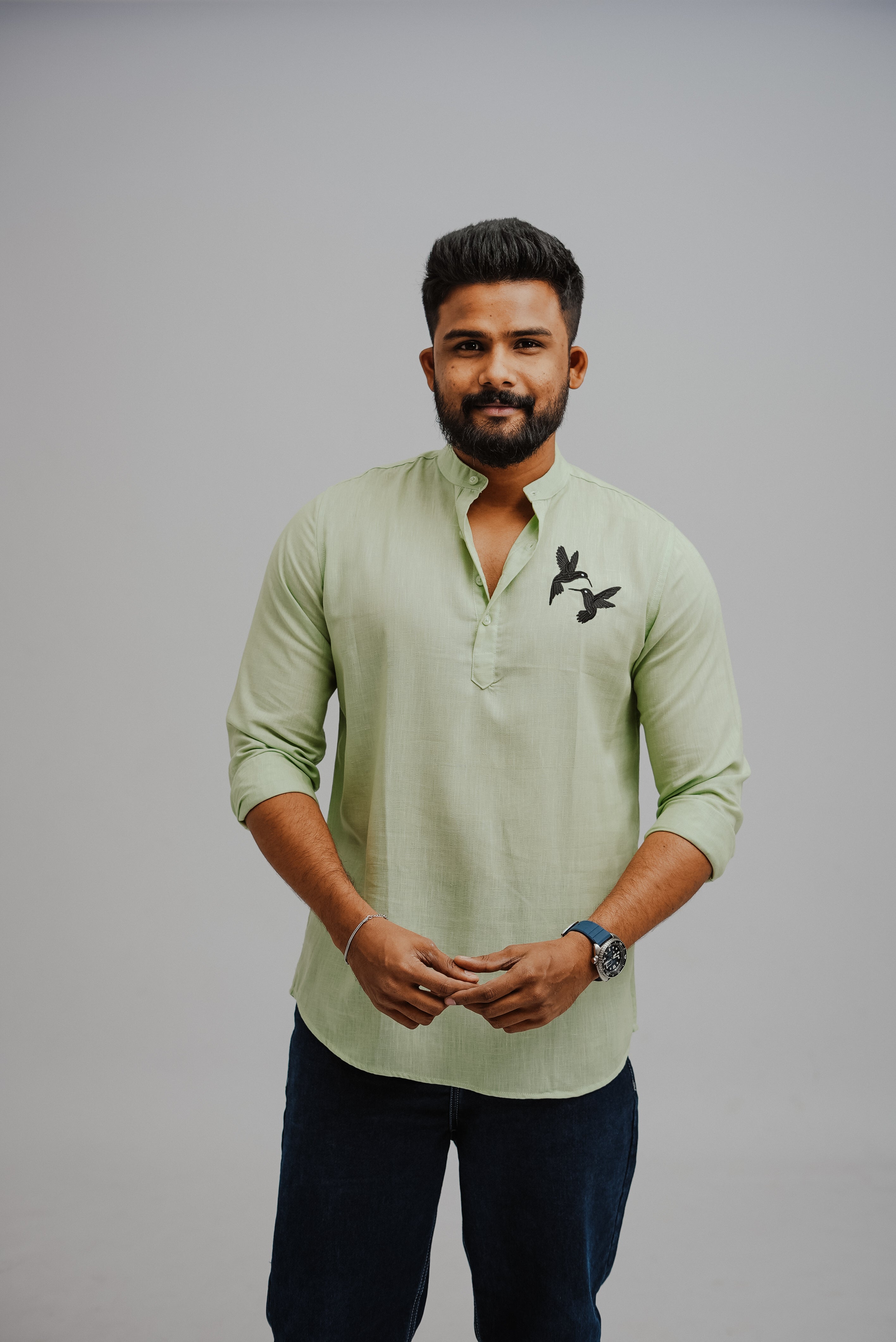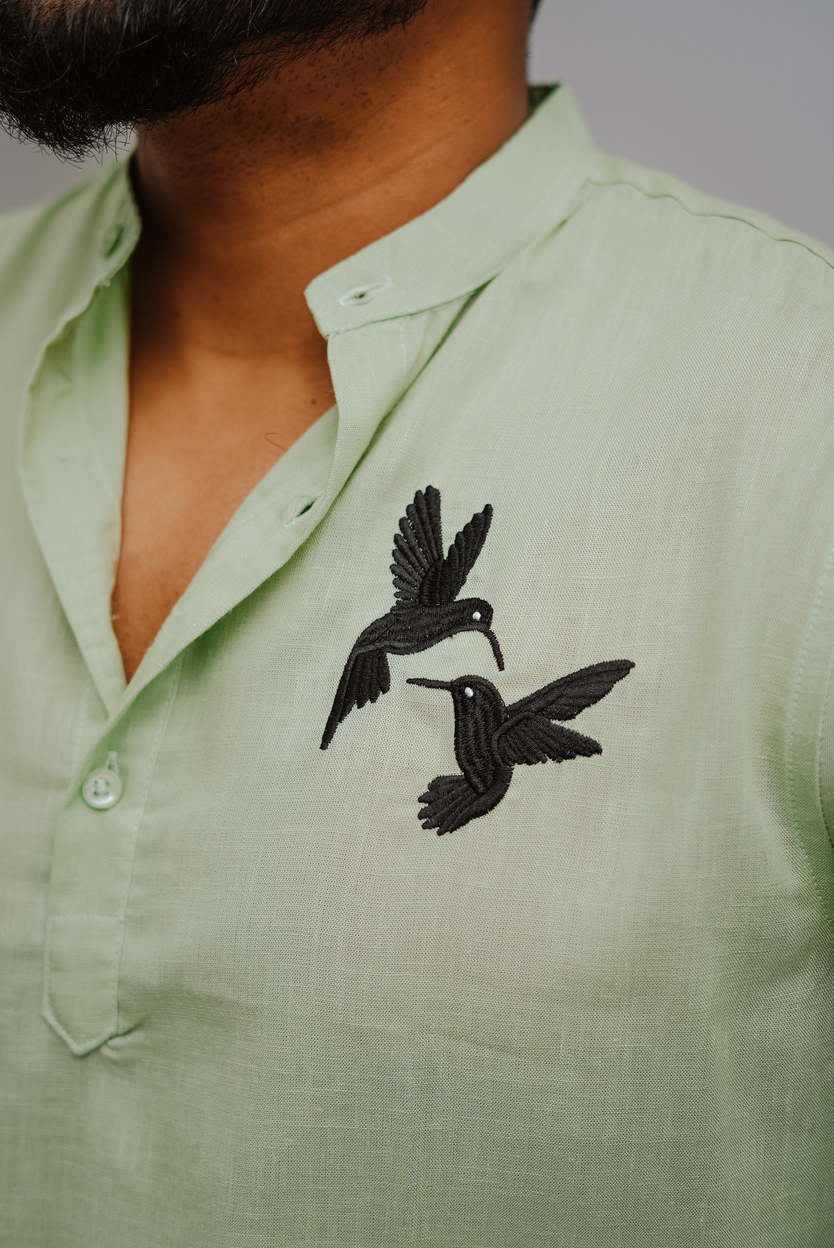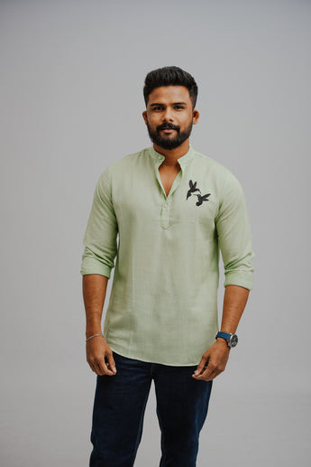 Dove Drift is a contemporary short kurta crafted in smooth, lightweight linen for ultimate comfort and breathability. Featuring two embroidered pigeons, it symbolizes harmony, connection, and quiet elegance. Its effortless design pairs perfectly with slim-fit trousers or churidars, making it ideal for festive gatherings, or semi-formal occasions.