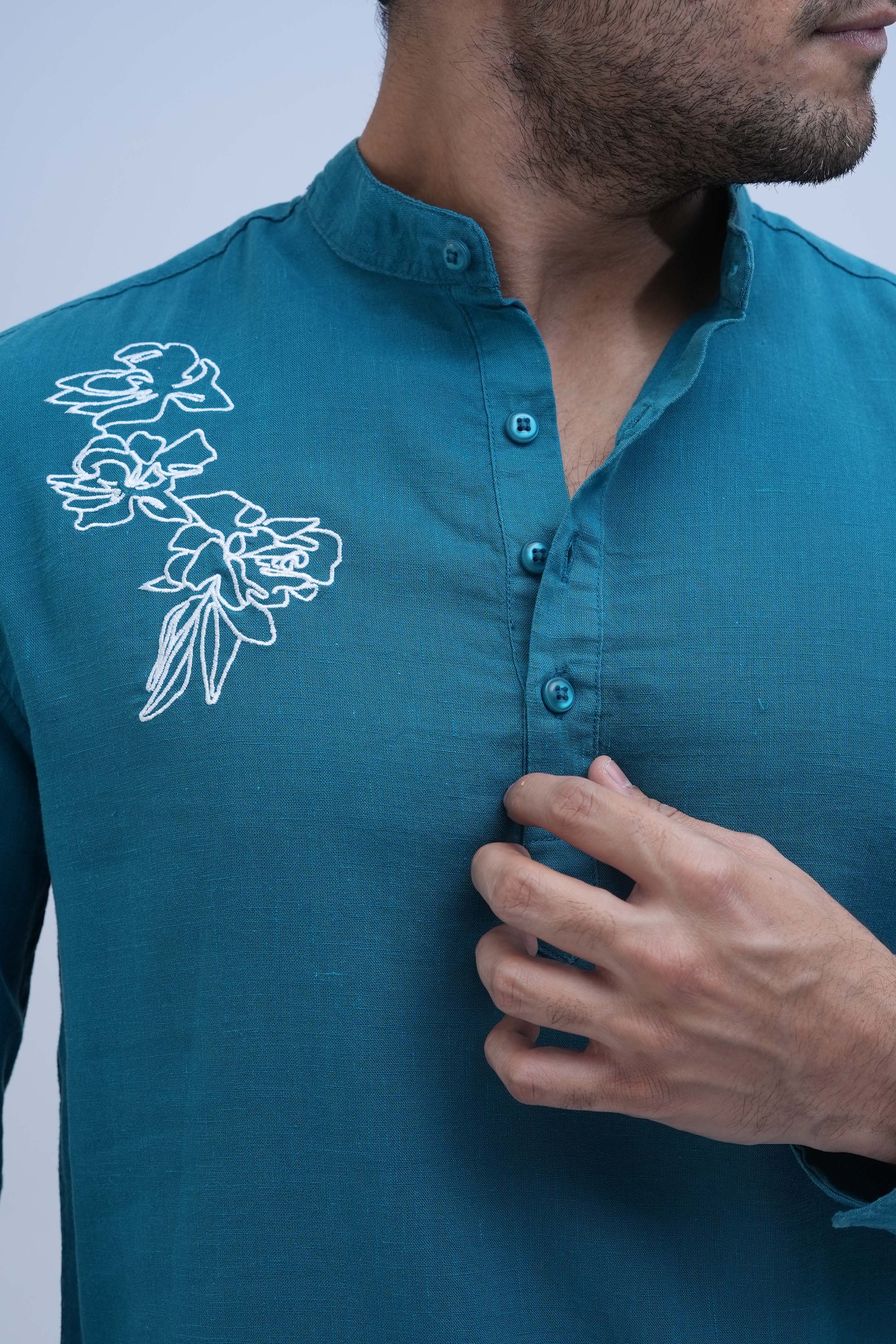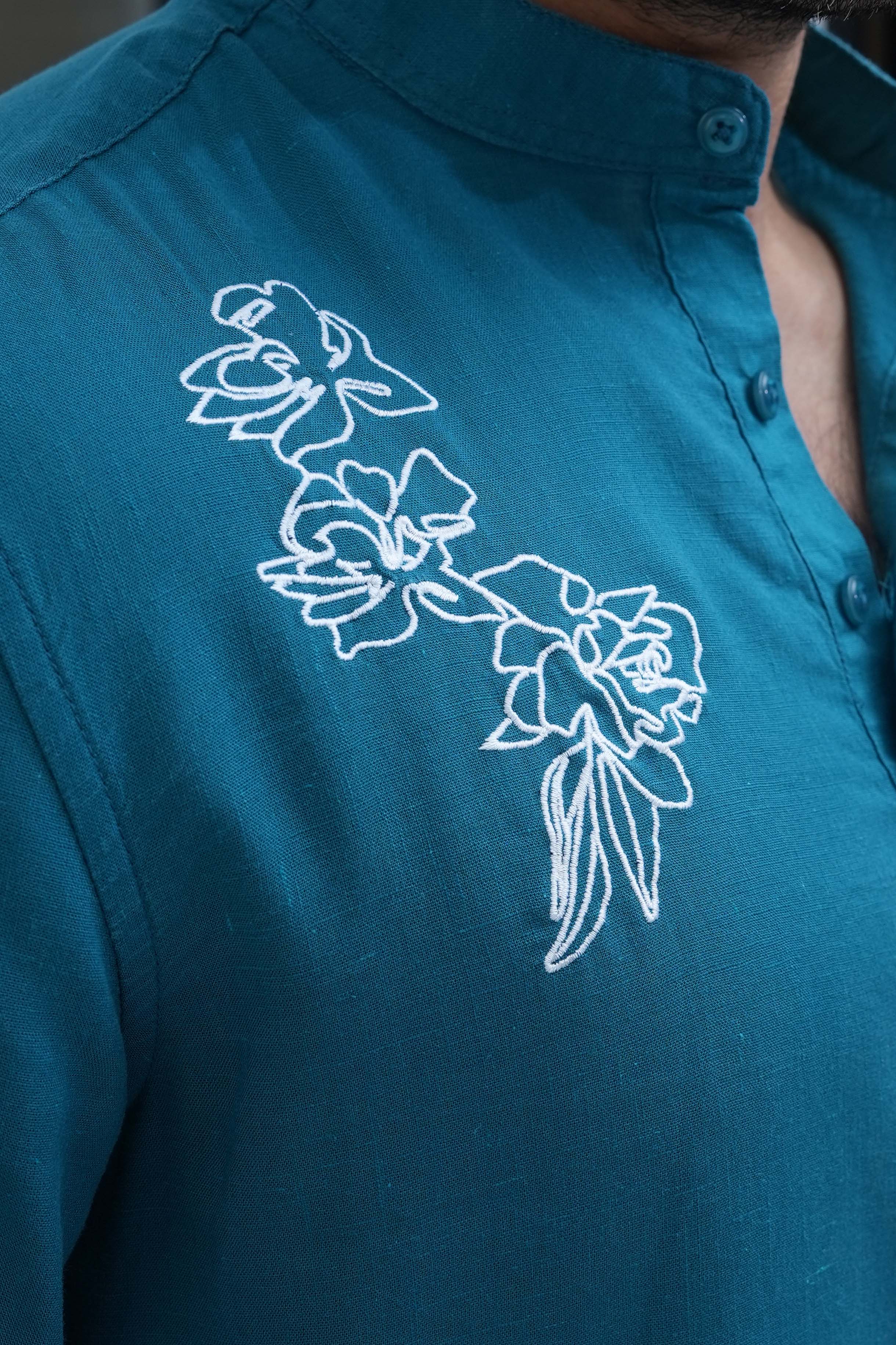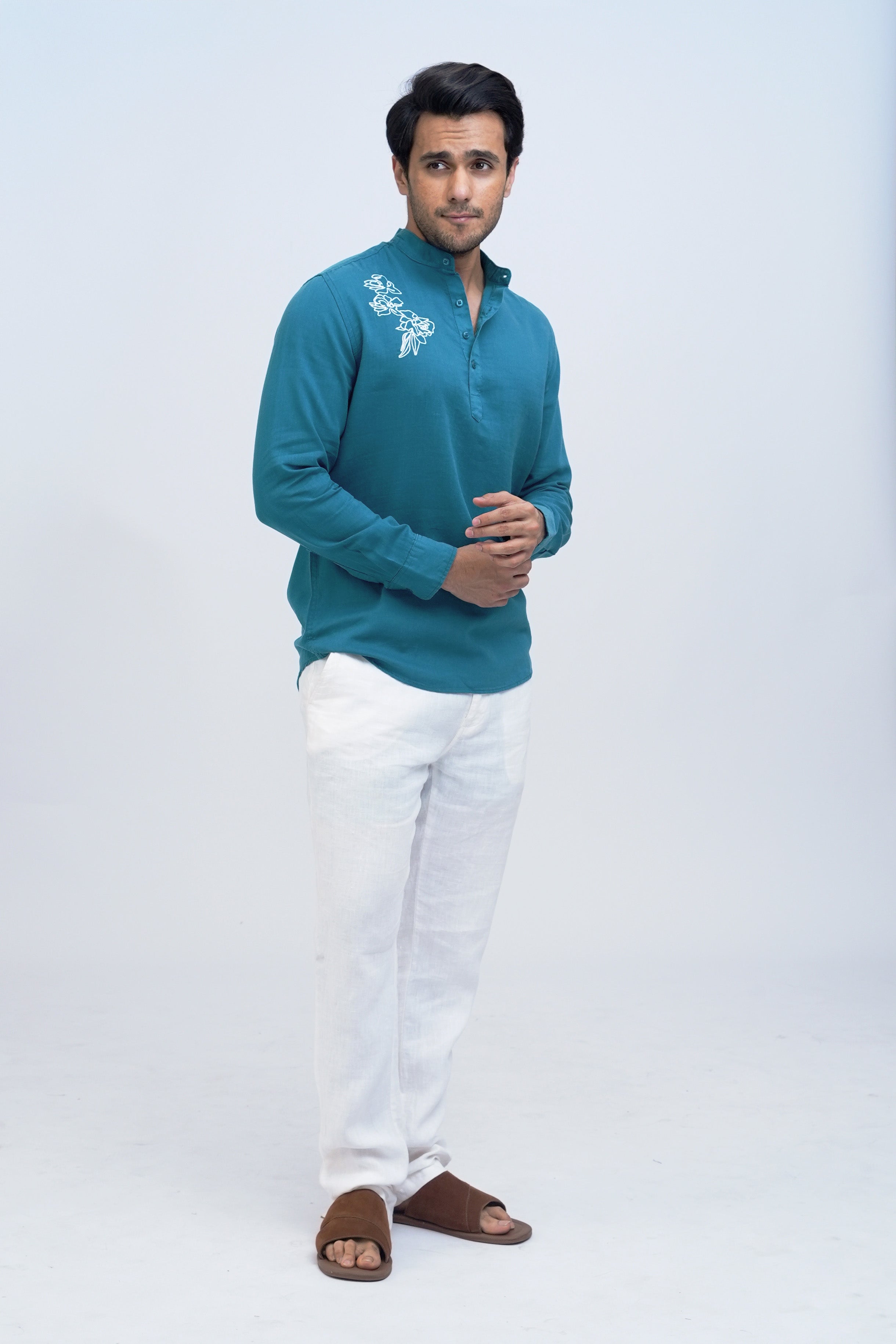 Petal Trace is a modern festive essential crafted in a breathable fabric with a soft, understated sheen. The relaxed-fit silhouette is accented with delicate floral line embroidery, tracing organic petal forms that add subtle texture and quiet elegance. Finished with a clean mandarin collar, it keeps the look refined yet effortless.