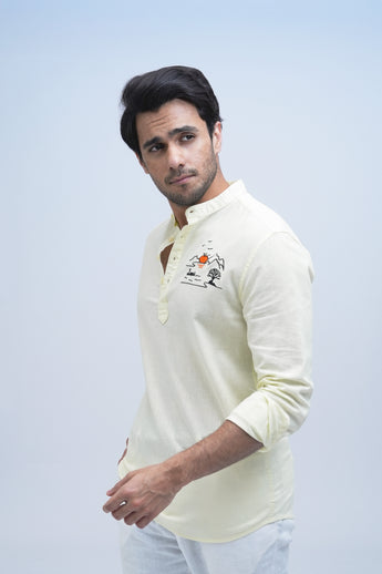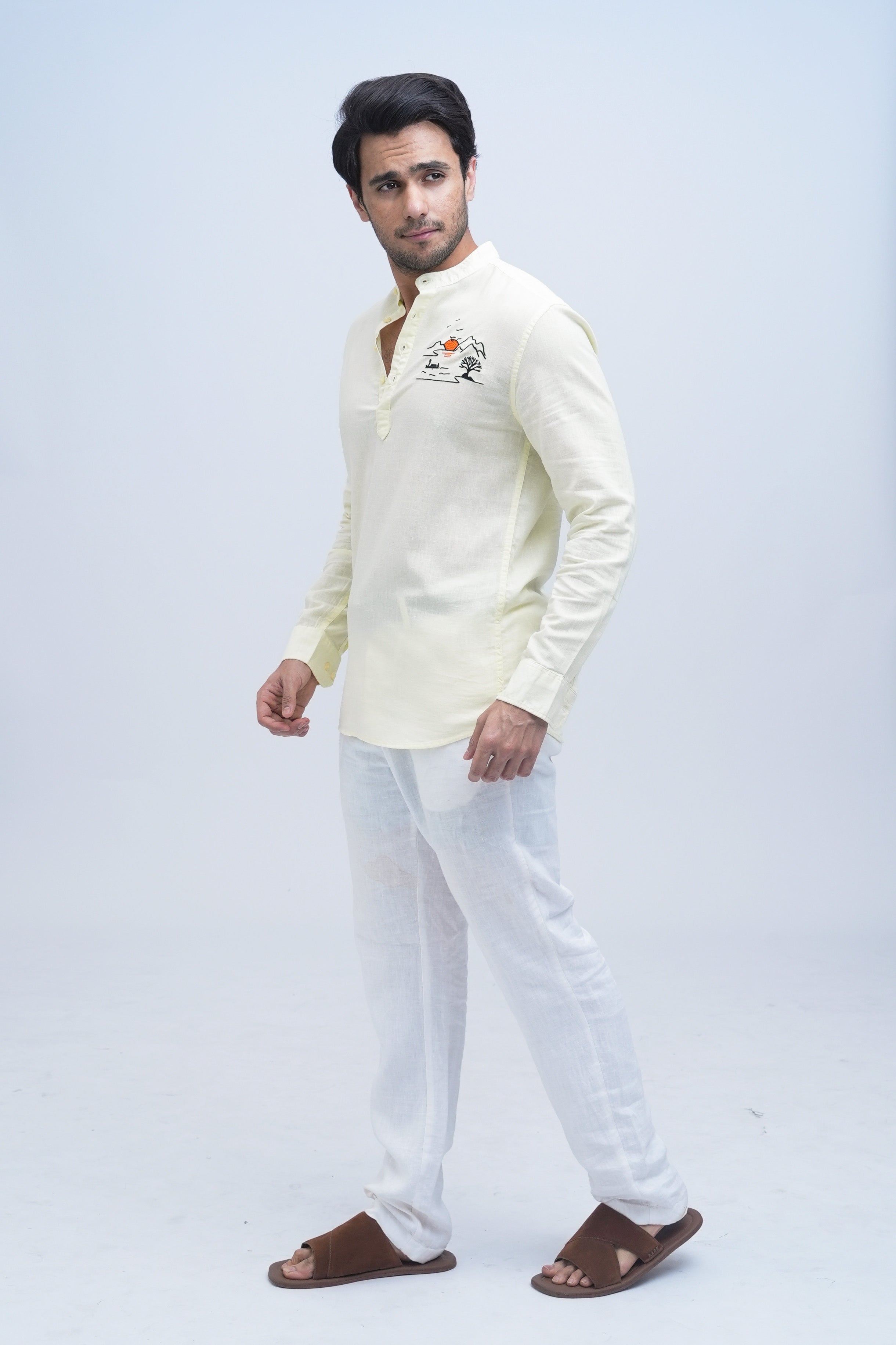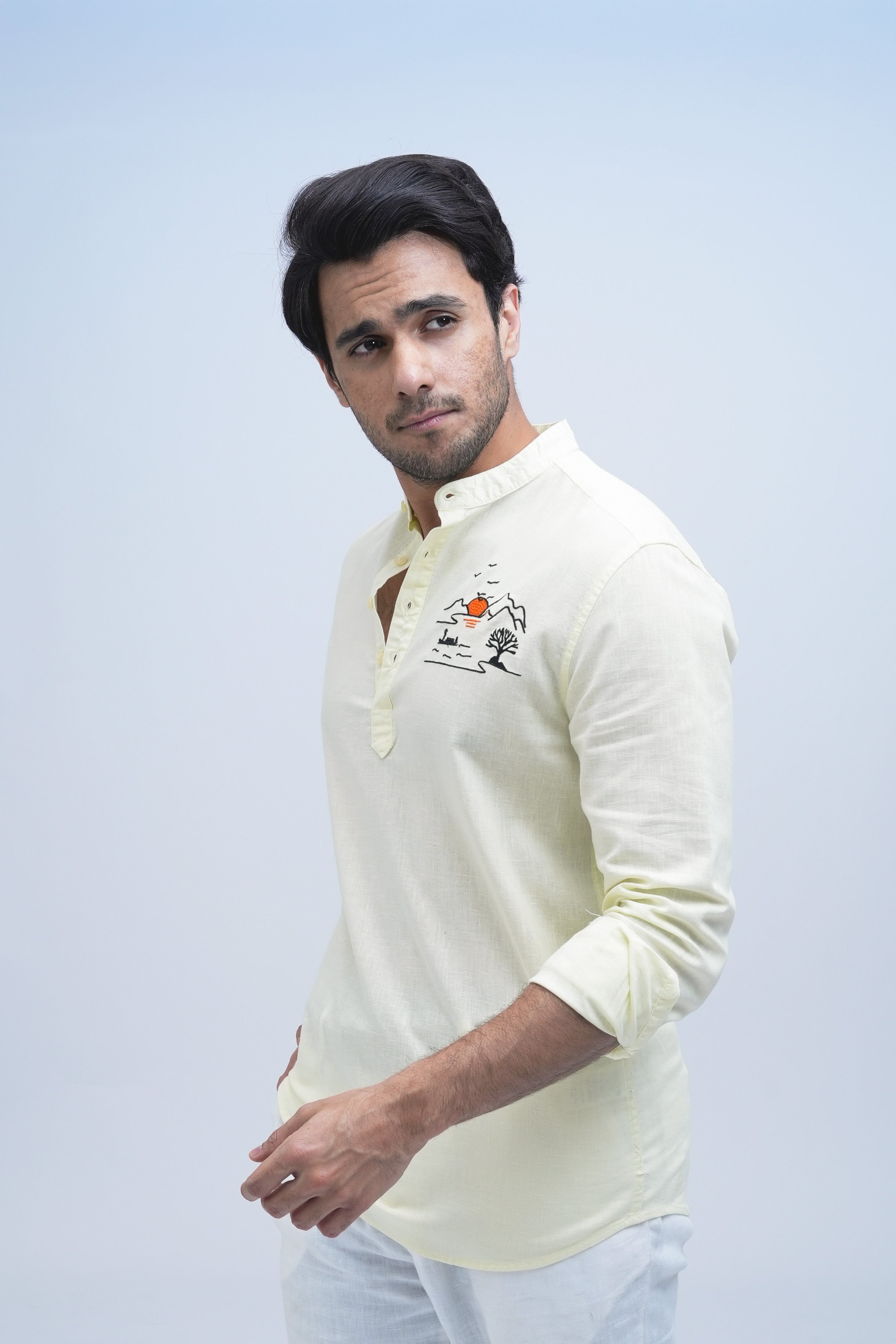 Scenic Stillness is crafted in a soft, breathable fabric with a gentle, muted finish that feels light and effortless. The relaxed-fit silhouette is highlighted with a serene landscape embroidery, featuring a subtle pop of colour that brings the design to life while keeping the overall look minimal. Finished with a clean mandarin collar, it reflects calm, modern elegance.