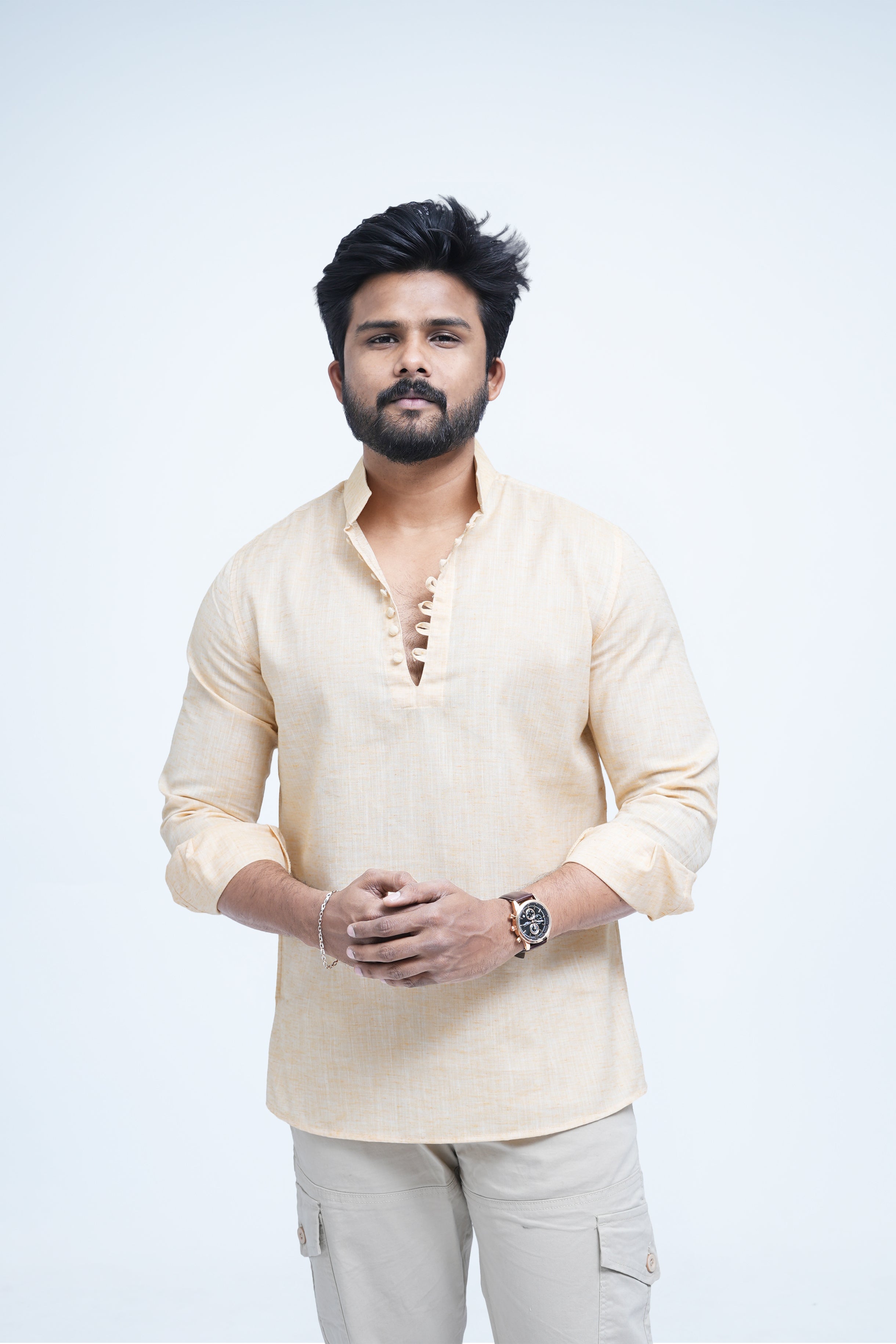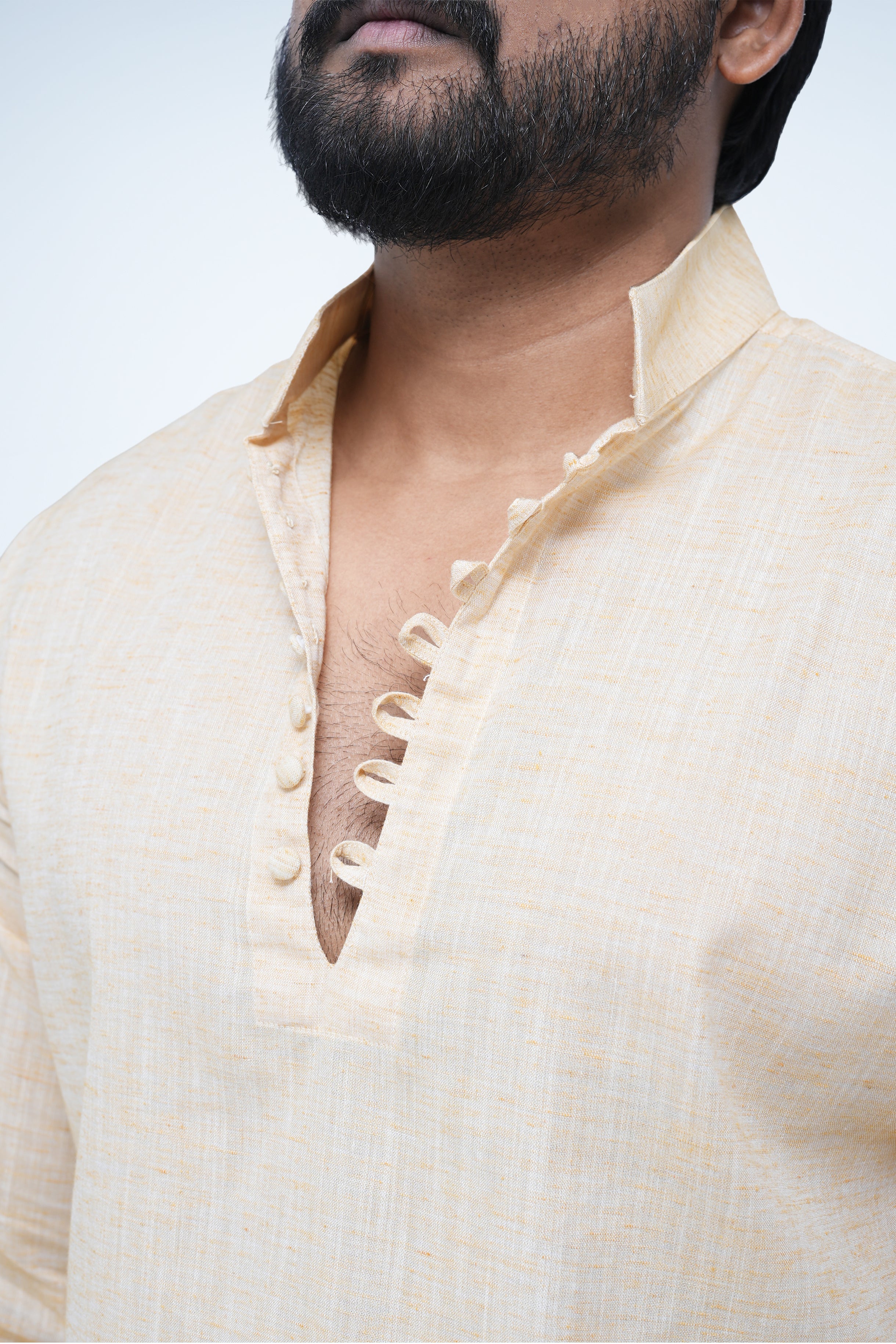 A modern short kurta in lightweight linen, designed to keep you cool and comfortable through the day. Finished with fabric-covered buttons and a refined texture, it blends minimal style with understated elegance.