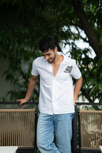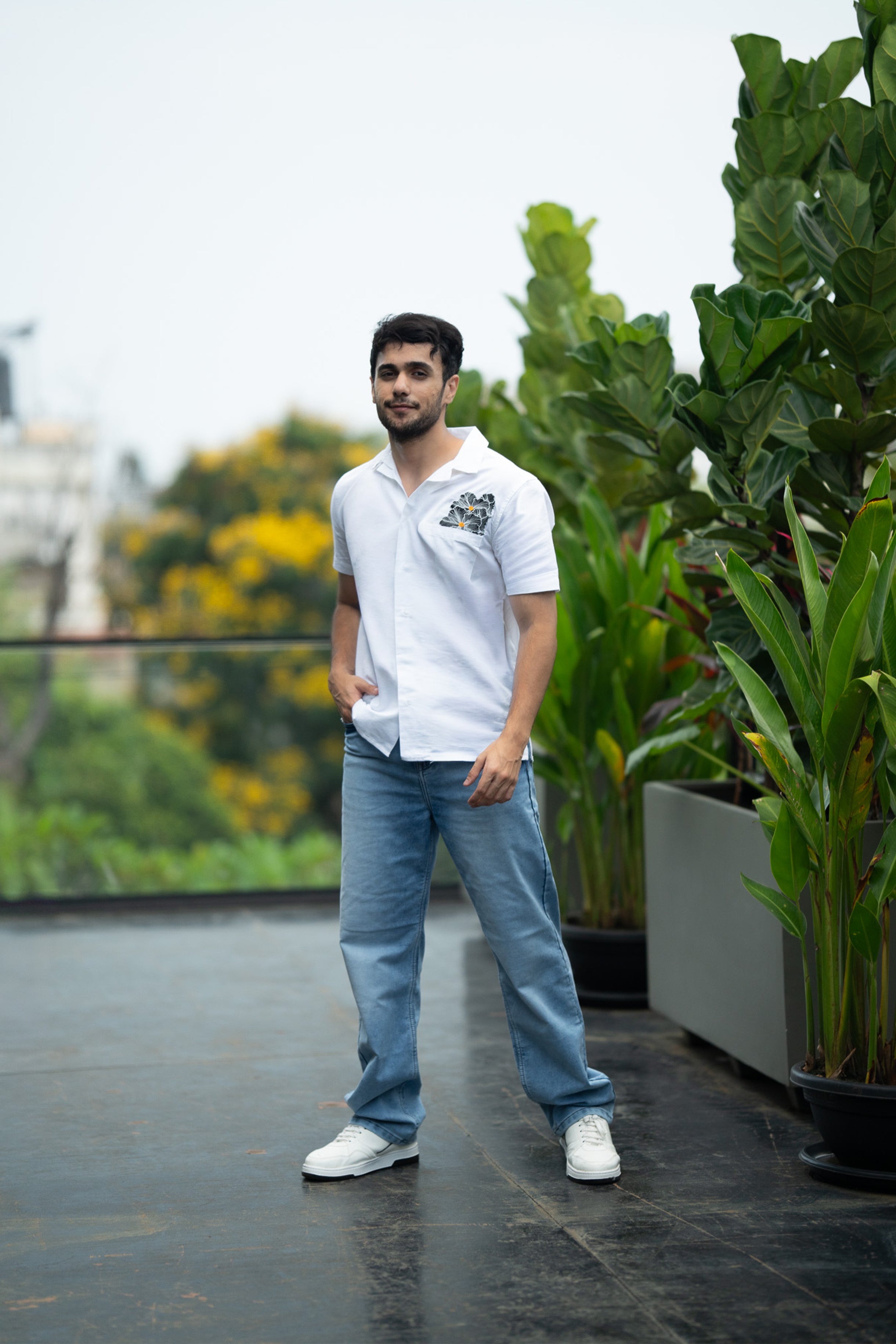 Bloom blends relaxed structure with artistic detail. This relaxed fit Cuban collar designer shirt features floral embroidery emerging from the chest pocket, creating the illusion of blooms casually tucked in, subtle yet striking.